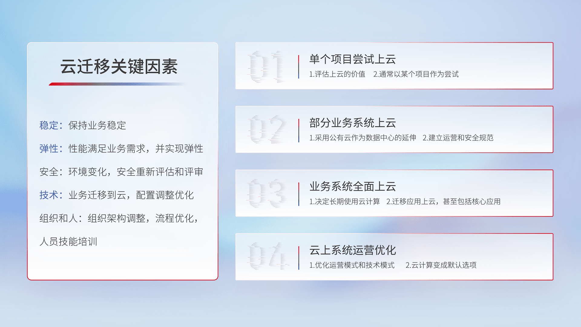 结合实际业务,,,,从规划设计、、、、云平台选型、、、云原生改造、、数据迁移、、集成交付,,迁移全过程为客户识别最佳上云路径,,做好风险识别管理,,设计网络架构、、、身份权限、、、、安全审计合规、、、、操作审计、、、日志审计、、、监控告警策略、、、、多站点容灾设计等,,,对云上基础设施进行整体规划,,,,提升IT治理水平,,,,以满足弹性、、高可用、、、、高性能的需求。。