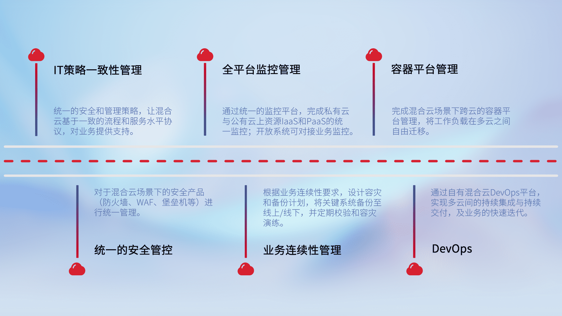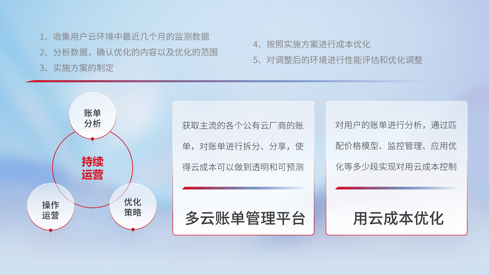 通过多云纳管,,,以统一的资源数据模型把客户的云资源进行抽象和封装,,进而实现对多云资源的统一操作,,保障云资源管理的可靠性、、、、稳定性与可用性。。。量身定制化运维内容,,,配置、、开发运维、、补丁管理、、备份、、监控、、、、认证和访问管理、、、审计和日常巡检等,,,,保障在用云过程中的可靠度,,,,稳定度以及高可用率。。。